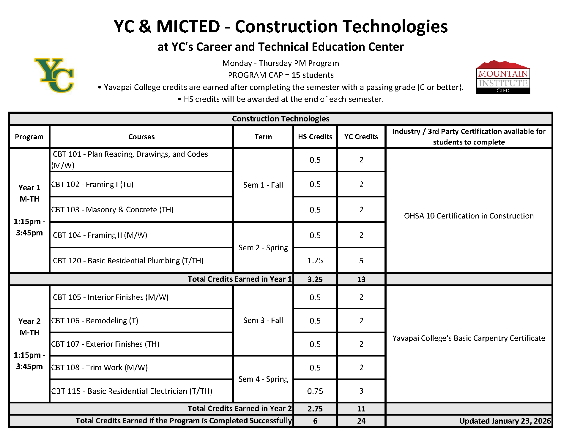 Up to 6 High School credits for both years and up to 24 Yavapai College credits for both years.