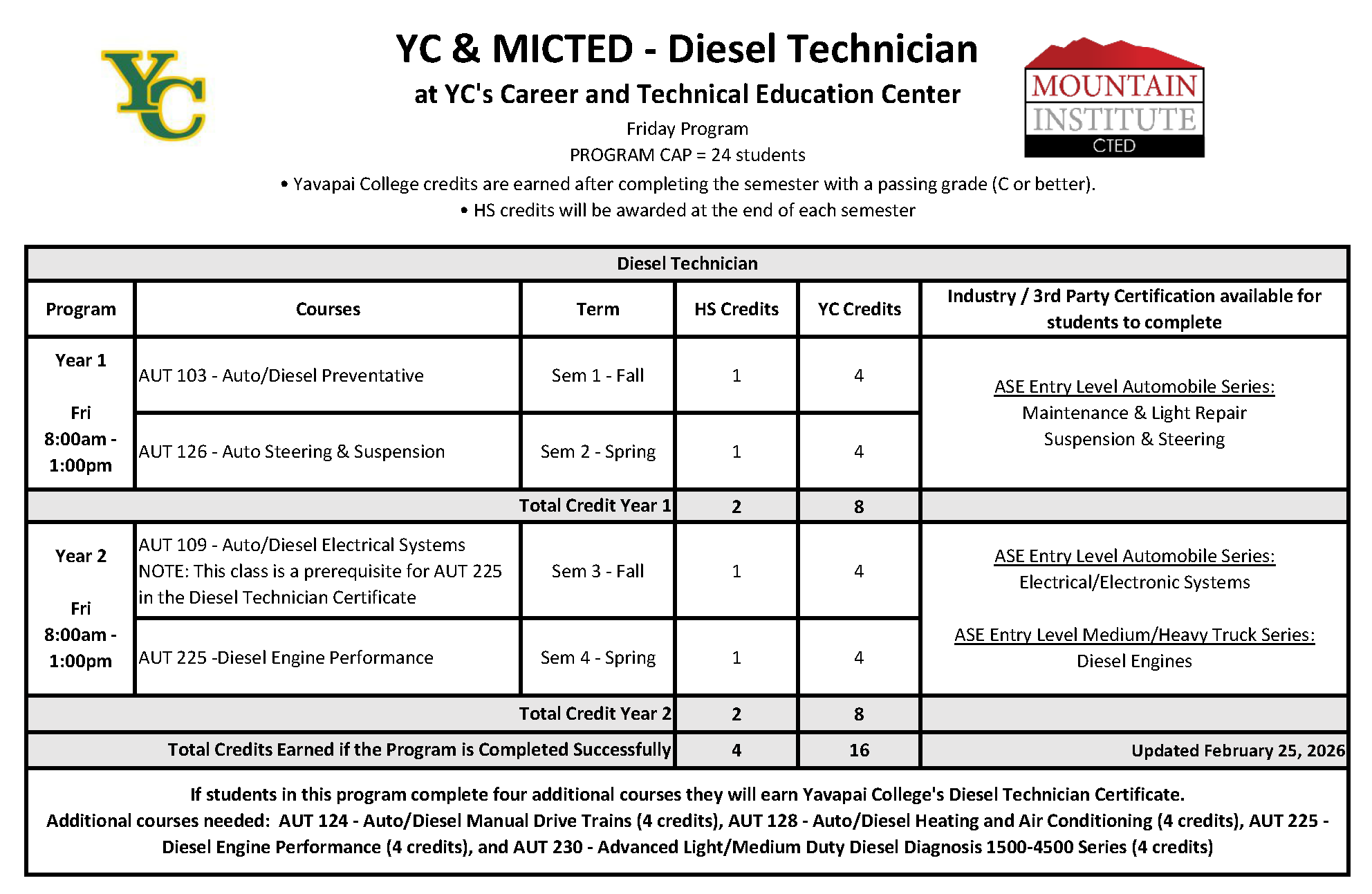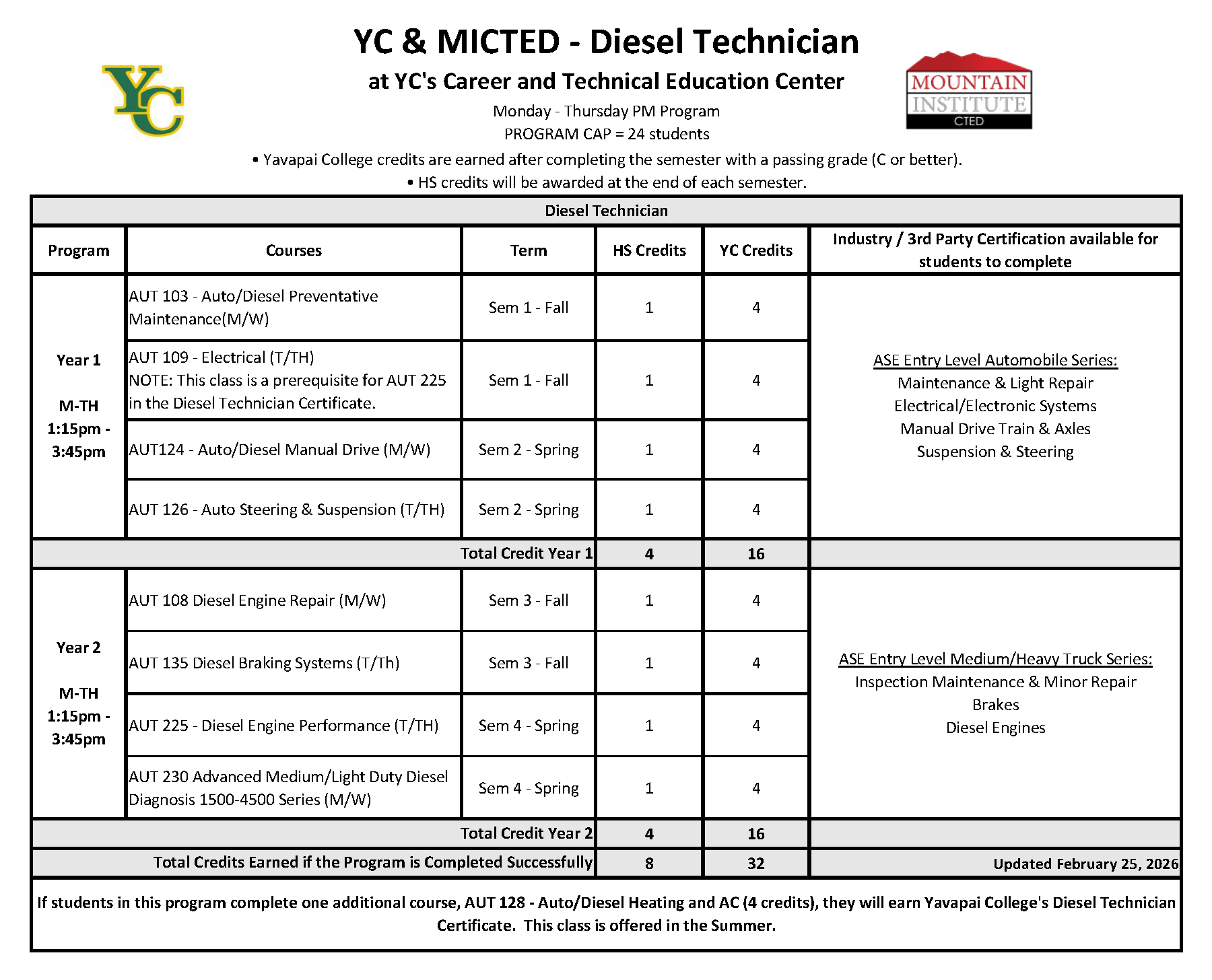 • 8 High School credits, and 32 YC credits will be awarded upon completion Monday-Thursday class schedule
