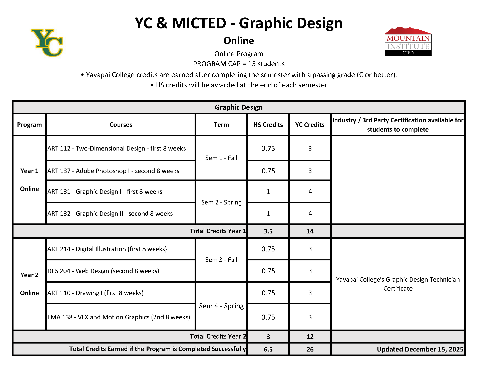 • Students may earn up to 7 High School credits and 28 Yavapai College credits upon successful completion of the program.