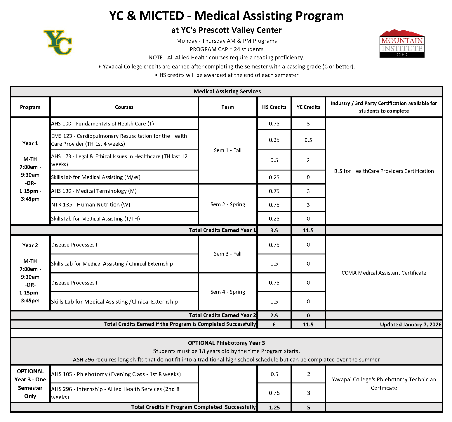 Students may earn up to 6 High School credits and 11.5 Yavapai College credits upon the successful completion of the program.