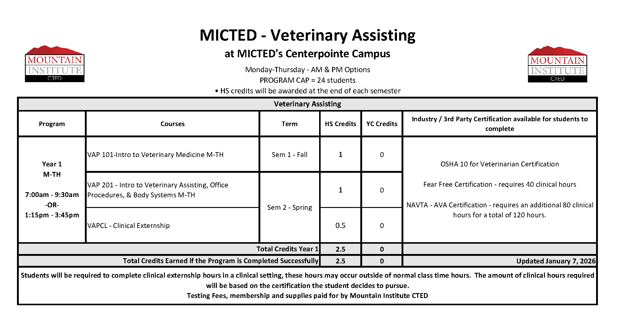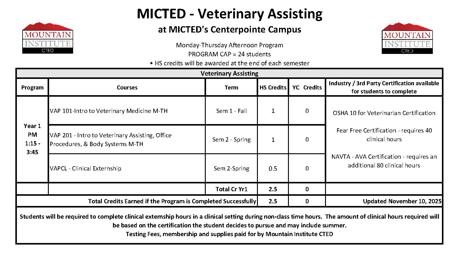 - Students may earn up to 2.5 High School credits upon the successful completion of this program.
