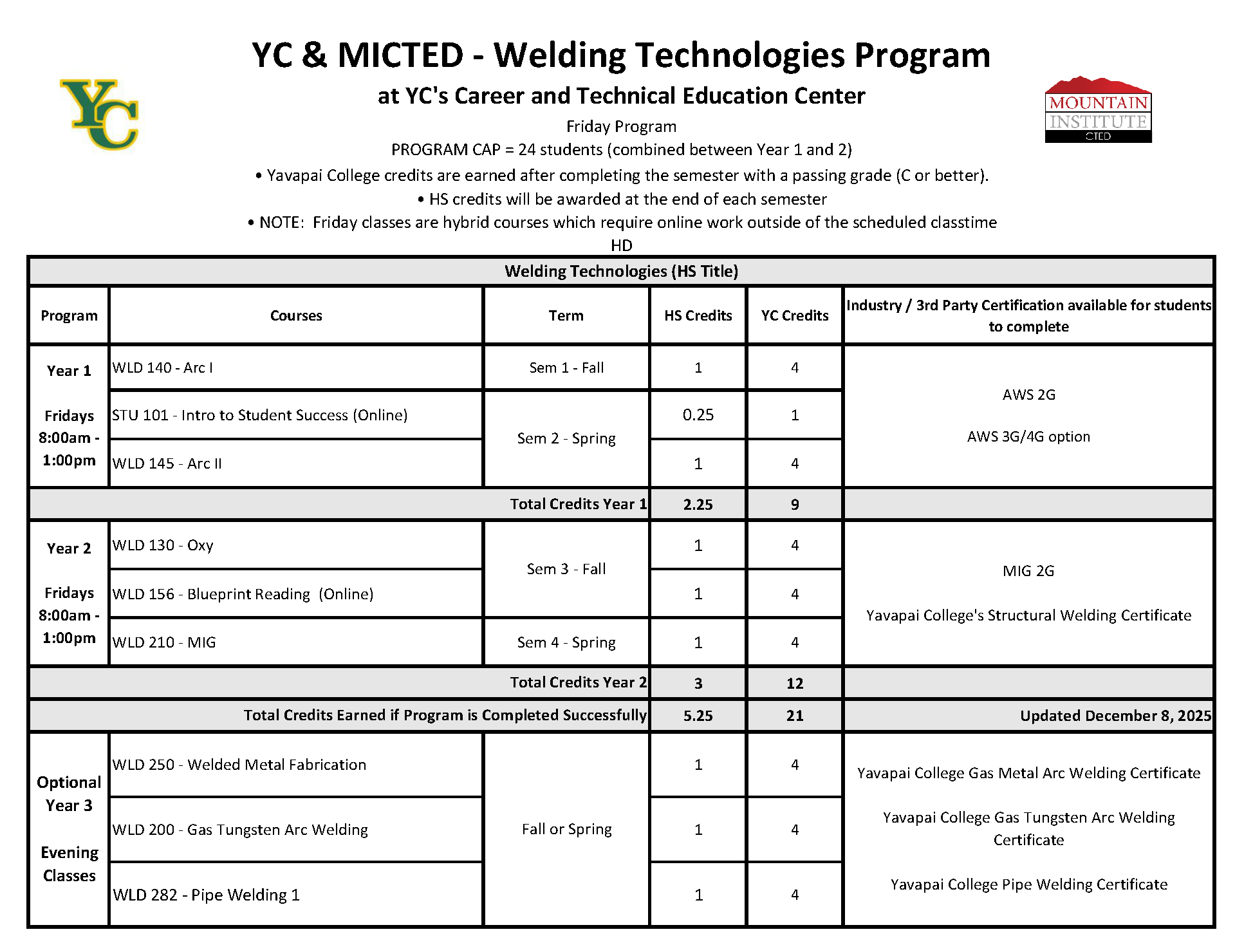Students may earn up to 5.25 High School credits and 21 Yavapai College credits upon successful completion of the program.